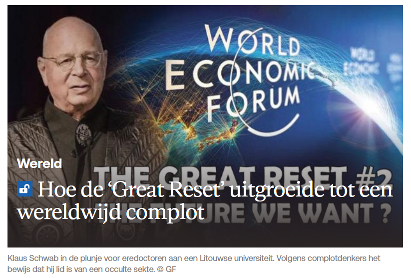 Maar voor sommigen zit er veel meer achter de Great Reset. Het zou gaan om een plan van de wereldwijde elite om een coup te plegen op de wereldbevolking en zo vrijheid, privacy en eigendom in te perken. Tijdens de coronajaren vonden sommigen in het boek zelfs het bewijs dat de pandemie 'gepland' was om die doelstellingen te realiseren.