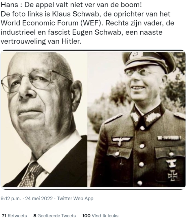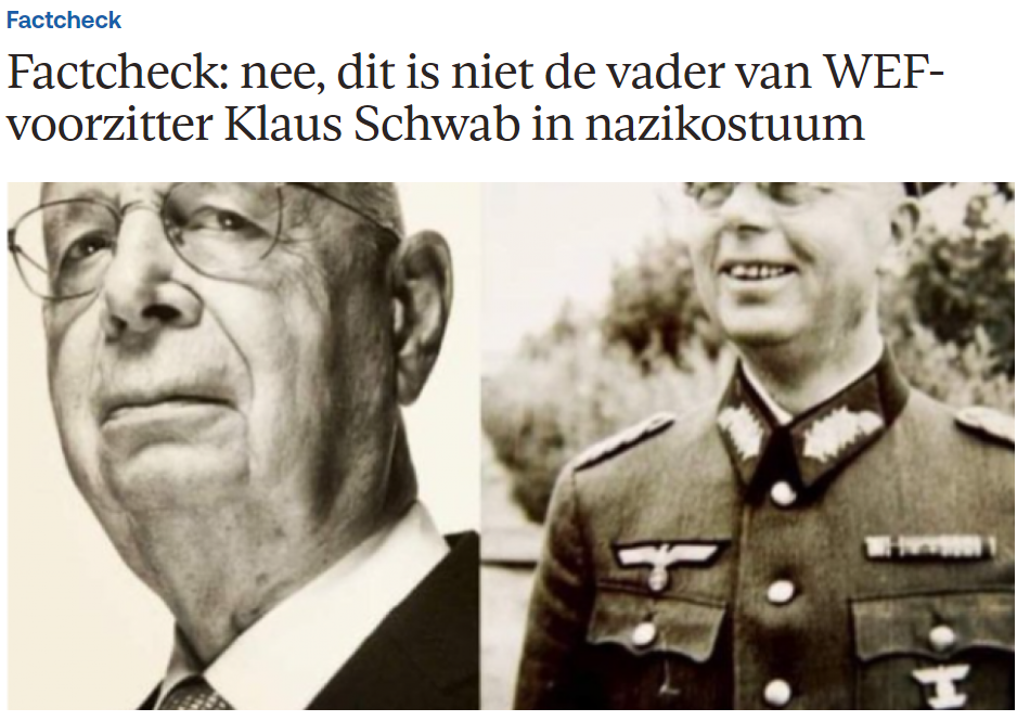 Ook de vader van Schwab krijgt ervan langs. Hij zou tijdens de Tweede Wereldoorlog als nazi actief zijn geweest. Het 'bewijs' daarvoor is weliswaar geen foto van zijn vader, maar van de Duitse generaal-majoor Walter Dyabilasz. Dat achterhaalden de factcheckers van Knack.