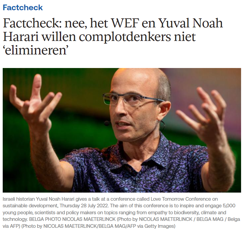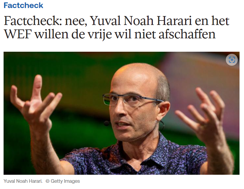 Harari wil ook geen 'complotdenkers elimineren' of 'de vrije wil afschaffen', zoals anderen beweren. In beide gevallen werden woorden van Harari uit hun context getrokken en verkeerd geïnterpreteerd. Bovendien werden ze aan het WEF toegeschreven, terwijl Harari ze niet in die context uitgesproken of neergeschreven had.