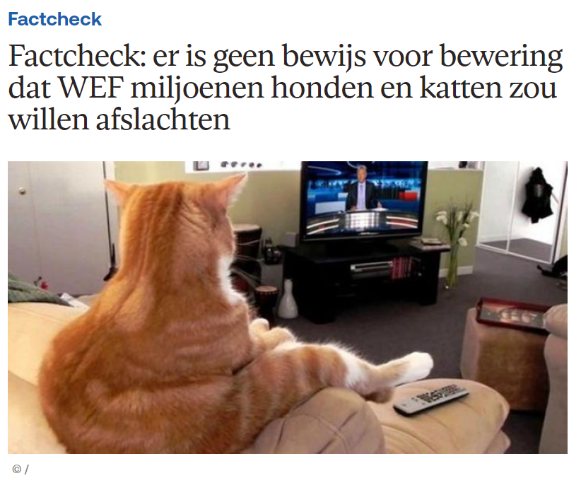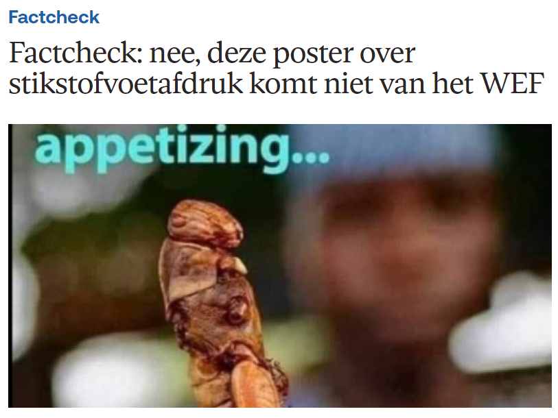 Een ander voorbeeld zijn theorieën over de stikstofplannen, die op hun beurt worden toegeschreven aan het WEF. De Nederlandse stikstofplannen zijn namelijk op 2030 gericht. Maar het WEF heeft niets te maken met die plannen. Dat ontdekten de factcheckers van Knack na het controleren van een poster over de stikstofvoetafdruk.