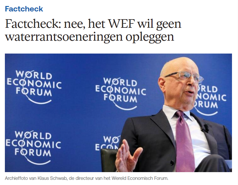 Ook beweringen over het 'toevoegen van insecten aan voeding' en het 'rantsoeneren van water' passen in dat rijtje. Waterbeleid is het nieuwste mikpunt voor mensen die duurzaamheidsinspanningen en klimaatplannen ter discussie stellen. Ondanks het ontbreken van bewijs, wijzen ook zij het WEF aan als spin van dat nieuw gesponnen web.