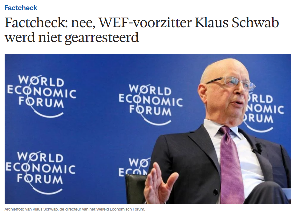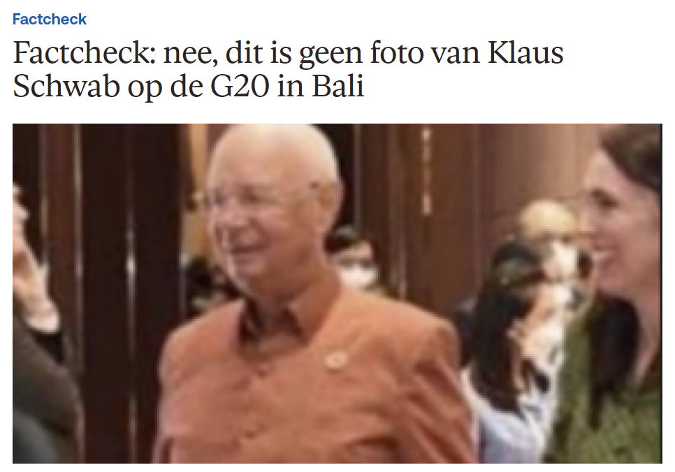 De meeste theorieën gaan over Klaus Schwab zelf. Zo worden foto's van hem geregeld gebruikt om aan te tonen dat hij op bepaalde evenementen aanwezig was. Dat was bijvoorbeeld het geval voor de G20 in Bali. Schwab was daar inderdaad, maar de afbeelding was genomen op een andere conferentie.