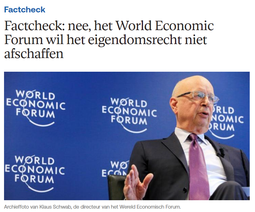 Een van de voorspellingen is: 'Je zult niets bezitten. En je zult gelukkig zijn'. Volgens critici zou het gaan om een communistische oproep tot de afschaffing van privébezit. Maar verder in de video staat er: 'Wat je wilt, zul je kunnen huren. En het zal geleverd worden door een drone.' Het WEF wil het privébezit dus helemaal niet afschaffen. Dat ontdekten factcheckers van Knack.