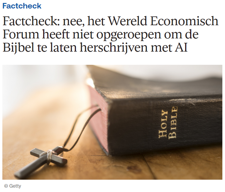Maar het gaat veel verder dan vrije wil alleen. Uitspraken van Harari over 'hackable bodies', of het zogenaamde voornemen om de Bijbel te 'herschrijven met behulp van AI', worden ook gelinkt aan het WEF en onder de noemer Great Reset geplaatst. Maar die zaken komen helemaal niet voor in het boek van Schwab en Malleret.