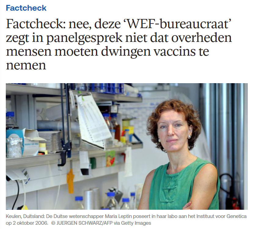 Ook voorzitter van de Europese Onderzoeksraad (ERC) Maria Leptin werd als 'WEF-functionaris' bestempeld en om haar uitspraken bekritiseerd. Zij zou gepleit hebben voor 'gedwongen vaccinatie', maar dat klopt niet, zo bleek uit een factcheck van Knack.