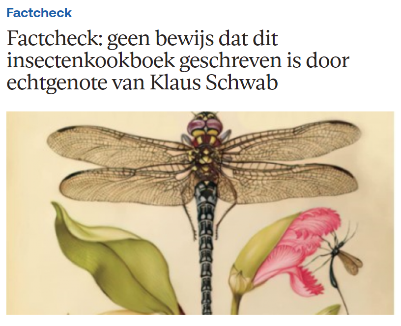 De meeste theorieën gaan ongetwijfeld over Klaus Schwab en zijn familie. Zo zou zijn vrouw een 'insectenkookboek' geschreven hebben - dat het WEF de bevolking zou willen aanzetten of zelfs verplichten tot het eten van insecten komt vaak terug in de theorieën rond de organisatie. Maar er is volgens factcheckers van Knack geen bewijs voor.